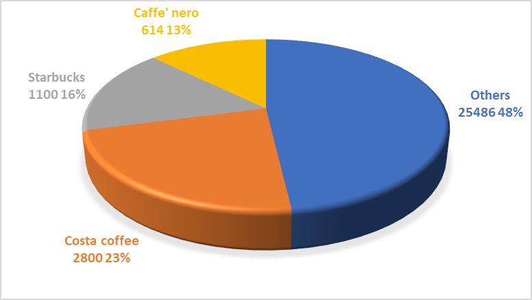 The coffee shop industry in the UK comprises around 30,000 stores with a combined annual turnover of around 15 billion pounds. The main companies include Costa, with about 2800 shops, followed by Starbucks with more than 1100 shops, Caffe Nero 614 shops and others. 80% of people who visit coffee shops do it at least once a week, 16% every day and take-away coffee is the most sold.